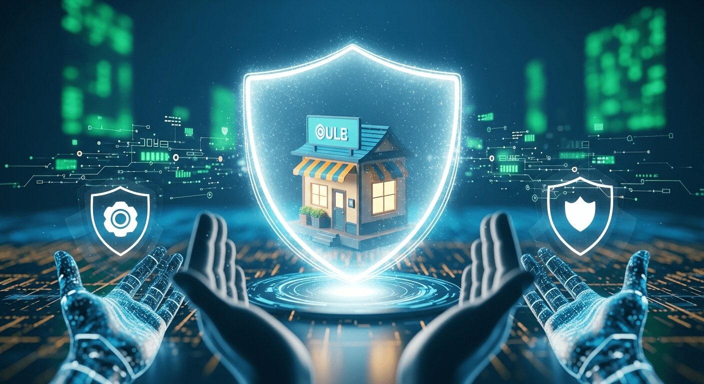Escudo de proteção digital em volta de uma loja online pequena, simbolizando segurança para loja online pequena como evitar golpes e proteger clientes contra fraudes cibernéticas